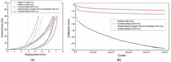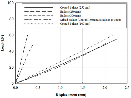 Figure 8 shows the results of applying a static load to the normal and coated ballast, and it is observed that the coated ballast had greater settlement and greater stiffness compared to the normal ballast under the same load conditions. The reason for this result is that the flexible polymer compound resisted the load when it was applied. As a result of the numerical analysis, the slope was similar when 150 mm of normal ballast and 150 mm of coated ballast were mixed and when 250 mm of coated ballast was stacked. Thus, the numerical analysis could not simulate all aspects of the ballast, such as the ballast arrangement and mud-pumping. However, by using the mechanical properties of the material, the relative durability of the normal ballast and coated ballast samples could be inferred from the vertical displacement and settlement observed under static and cyclic loads, respectively. The experimental and simulation results were different because of the uneven shape of the actual ballast, in contrast to the uniform ballast shape used in the simulation. In the experimental test, the friction between the ballast, crushing, and change in the voids between the ballast resulted in a rather large difference from the experimental result. However, as shown in Figure 8, the slopes (static spring stiffness) of the load–displacement curves obtained from the model and experiment were similar (reduced) for the coated ballast.