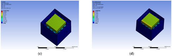 The behavior of the ballast and the coated ballast in the ballast box tests was confirmed through numerical analysis performed with ANSYS workbench version 2021 R1 [19]. The mechanical properties of the material used in the numerical analysis are shown in Table 1. For the boundary conditions of the numerical analysis model, the bottom of the ballast box was fixed, while static and repeated loads were applied to the load plate on the top of the ballast, similar to the experimental conditions described in Section 2. Since the model could not simulate the particle size distribution of the ballast in the same way, ballast particles were modeled as spherical and prismatic solid elements. Therefore, even if 250 mm of the coated ballast is not installed, mixed ballast is suitable for installing coated ballast on normal ballast in consideration of economic feasibility and on-site construction. In addition, a contact-stiffness behavior model and a slip behavior model were chosen and applied to the linear mechanical properties model. Figure 7a shows the numerical analysis modeling, Figure 7b shows the boundary conditions and load conditions, and Figure 7c,d show the numerical analysis results. In Figure 7c, it is observed that the vertical displacement that occurred in the normal ballast was smaller than that of the coated ballast shown in Figure 7d. However, in the stress comparison shown in Figure 7e,f, it is observed that the resistive stress value of the coated ballast was more than 60% greater than that of the normal ballast.
