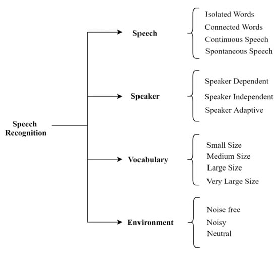 Speech recognition is a multidisciplinary research area consisting of linguistics and computer science. It is also called speech-to-text (STT), computer speech recognition, or ASR. The ASR system accepts spoken words in an audio format, such as .raw or .wav files, then generates its content in text format and makes a computer understand the natural language. By “understand”, we mean to react appropriately, or transform the speech signal into another form, i.e., text. ASR systems generate models of given training data and speech is tested using these models, trained during the training phase. Depending on the type of speech, speaker, vocabulary, and environmental conditions, ASR systems are classified into different categories [], which are shown in Figure 2.