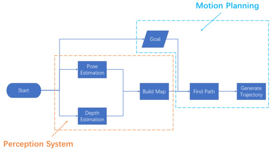 In this section, a general introduction to our autonomous motion system is given for a better understanding of the composition of our system and the role of each part. The flowchart of the autonomous movement system is shown in Figure 1. Briefly, the system consists of two parts, the perception system and the motion-planning system. The function of the perception system is to use the camera to estimate the robot’s pose and build a map of the environment. The motion-planning system takes the target position, the current pose estimated by the perception system, and the environment map is established as input to plan a safe and smooth path and output the path to the robot control system. Then the system can control the robot and follow this path to safely reach the target point.