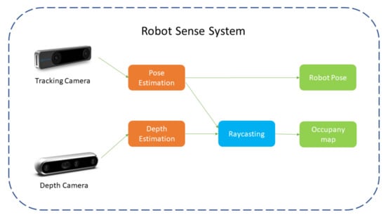 Schematic of the framework of the environmental perception system. The system uses a tracking camera and a depth camera as sensors to realize the estimation of the robot’s pose and build a map of the environment.