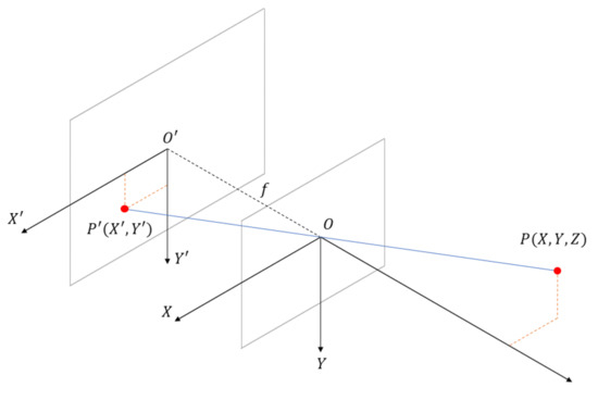 The camera projection model is shown in Figure 3. is an obstacle point which is projected by the optical center, O, on the imaging plane, , to obtain , and f is the focal distance of the camera. Therefore, according to the geometric triangle properties, the relationship between and can be obtained as follows: