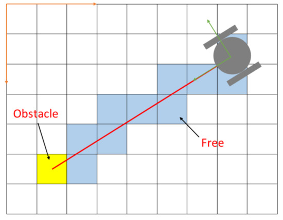 The principle of the Raycast Model is shown in Figure 4. The location information of the vehicle can be estimated by the T265 camera, while the location information of the obstacles can be obtained by performing a calculation using the depth map. If there are other obstacles in the middle cell (the blue cells in the figure) where the line between the vehicle position and the obstacle position passes, the obstacles will be blocked and cannot be observed by the camera. Therefore, the blue cells in the figure should all be free states. Then we use the Bresenham algorithm to speed up the calculation of the passing nodes.