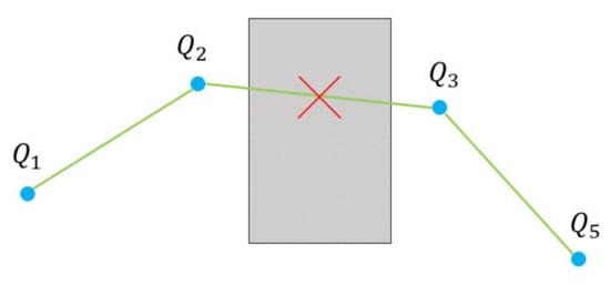 Through Section 3.3.1, we can ensure that the distance between the path point and the obstacle is greater than the set threshold, d0. However, as shown in Figure 5, there may be cases where the path point does not collide with the obstacle, but the path collides with the obstacle. The path points Q1, Q2, Q3, and Q4 all keep a safe distance from the obstacle, but the path segment Q2Q3 still collides with the obstacle. Therefore, in order to ensure the safety of the entire path, the conditions that need to be met are derived in this section.