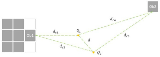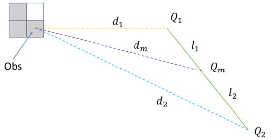 Our proposed method can accelerate the calculation of the SDF value of the cell. As shown in Figure 7, the closest obstacle to the path point is , and the distance between and is . The distance between and is . What we need is to calculate the closest obstacle to . If the ESDF information of is not available, the entire space needs to be searched. If the number of cells on the map is n, the complexity of the algorithm is .