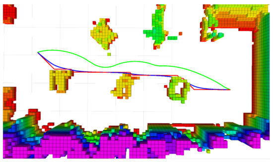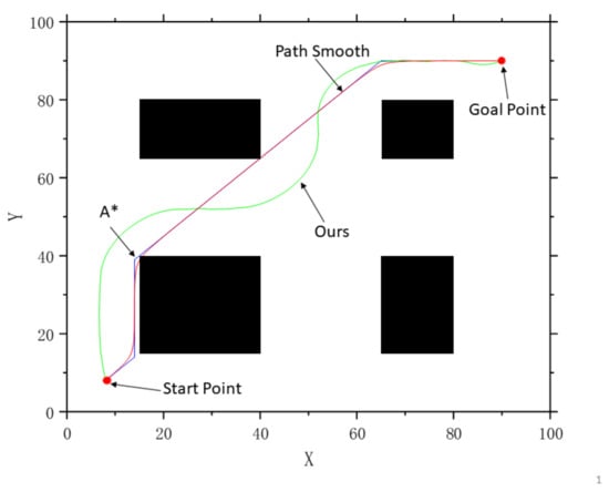Based on the grid map established by the mapping algorithm, the path planning was further conducted, and the result is presented in Figure 11. The red path is searched by the A* algorithm, the blue path is searched by the Path Smooth algorithm, and the green one is the path searched by the proposed algorithm. Obviously, the path searched by the A* algorithm is close to the obstacle and has multiple corners, which is not suitable for robot execution. The path searched by the Path Smooth algorithm collides with obstacles. By contrast, our proposed algorithm plan keeps a safe distance from obstacles and is relatively smooth. Moreover, in the actual test, the robot reached the target point safely along the path planned by our algorithm.