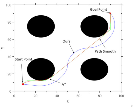 We optimize the loss function of Formula (8) by gradient descent to obtain a path. Compared with the initial path obtained by the A* algorithm, the path will be smoother and farther away from obstacles. Since we have set a larger value for k in Formula (11) and Formula (12), the path distance to the nearest obstacle d satisfies , and the distance, l, between two path points satisfies .