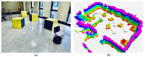 In this section, the effectiveness of our proposed algorithm was evaluated in the real world. The turtlebot2 robot was chosen as our experimental platform, which is a two-wheeled differential car robot widely used in robotics research. The test environment is an office environment of 10 m × 5 m with four cube boxes (0.8 × 0.8 × 0.8 m) placed as obstacles (Figure 10a). The algorithm was running on the same computer as mentioned in Section 4.1, installed with the ubuntu system.