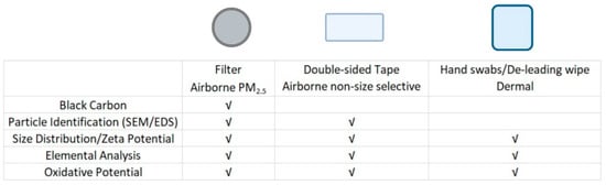 During each sample collection multiple sample matrices were used for size-selective (filters) and non-size-selective (double-sided tape, hand swabs) methods.