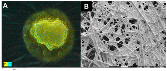 Representative FE-SEM/EDS images of DST and Filters. A representative image of a particle for the DST collection (A) is displayed with elemental overlay for Pb (yellow) and C (blue) after a single shot at 6500×; the scale bar indicates 5 µm. No particles were identified on the filter samples (B) which provided a complex matrix for imaging at 1000×; the white scale bar indicates 10 µm.
