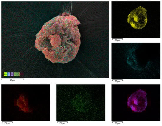 FE-SEM/EDS data for DST single shot sample. A representative GSR particle on DST from the single shot sampling shows the morphology and elemental composition. The elemental overlay of Ba (yellow), K (green), Ti (purple), O (red), and C (blue) along with a combined image (in the top left) are displayed at 1000× magnification; the scale bars indicate 25 µm.