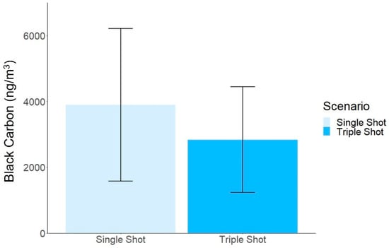 Average Black Carbon Concentrations. Averages and standard deviations of single (3893 ± 2316 ng/m3) and triple shot (2836 ± 1606 ng/m3) are reported (n = 4). Statistically significant differences were not observed between single and triple shot scenarios using the Welch’s t-test (p = 0.543).
