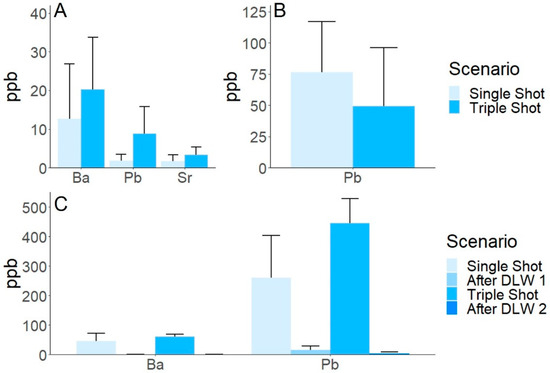Elemental Concentrations. The elemental concentrations (ppb ± SEM) are shown for Ba, Pb, and Sr in filter samples (A), Pb in DST samples (B), and Ba and Pb in hand swab samples (C). Statistical significance was determined using a Welch’s t-test for comparison of single and triple shot scenarios (filter and DST) and a one-way ANOVA for multiple group comparisons (hand swabs) with a p-value of ≤0.05 considered significant. No statistically significant differences were observed.