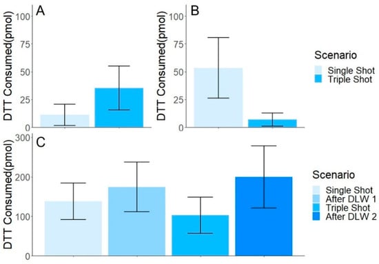 Oxidative potential was measured by DTT consumption with averages and SEM for single shot (11.1 ± 9.6 pmol) and triple shot (35.3 ± 19.9 pmol) (Figure 6A). There was a 68% increase in oxidative potential for the triple shot compared to the single shot averages. This increase was consistent with the observed increase in elemental concentrations for the filter samples based on number of shots. A previous study investigating PM2.5 identified metals as a major contributor to DTT consumption [64]. Additional DTT analysis of GSR samples may help identify differences based on the number of shots fired or specific firearms used.