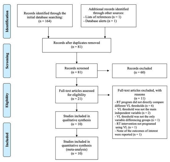 Comparators: The VL threshold was considered as the main independent variable. Eligible investigations should have described the VL threshold used by each experimental group throughout the training program (e.g., Group A = 10% VL vs. Group B = 30% VL). Studies in which the VL threshold was not the only training variable differencing the experimental groups were excluded. This review only considered those investigations in which the velocity of all repetitions performed throughout the RT program was monitored. Moreover, studies reporting the effect of only one VL threshold were excluded (e.g., 10% VL vs. Control group).