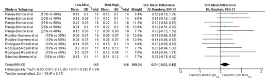 Between-group comparisons were used to analyze the VL threshold as a categorical variable (Low-ModVL vs. Mod-HighVL). Thus, experimental groups that trained using a VL threshold of 25% or lower (Low-ModVL) were compared with those that trained using a VL threshold over 25% (Mod-HighVL). This categorical analysis was complemented by within-group comparisons, for which the pre–post training effects of the individual VL thresholds that included either Low-ModVL or Mod-HighVL were computed to obtain an effect size (ES) for each group. Moreover, the VL threshold was studied as a continuous variable. For that, the coefficient of determination (R2) was used to examine the relationship between each individual VL threshold (e.g., 10%, 15%, or 20%) and its respective ES in each outcome. A minimum of two experimental groups (k ≥ 2) [23] using the same individual VL threshold was required to include it in the relationship analysis. On the other hand, the characteristics of the RT programs conducted by both VL groups were compared using a t-test.