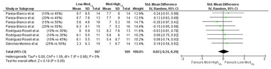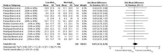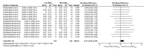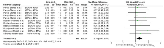 On the other hand, contrary to traditional beliefs supporting that higher training volume would produce greater enhancements in local muscle endurance [44], this review did not find large differences between Low-ModVL and Mod-HighVL thresholds to improve this capacity (Figure 5). Indeed, the within-group analysis showed superior effectiveness of Low-ModVL thresholds (ES = 1.50 vs. 1.14, Table 4). Among other factors, this finding could be explained by the slightly higher increments in the 1RM achieved by the Low-ModVL group (Table 4). As has been found by previous studies [34,40], changes in local muscle endurance are mainly related to the changes in 1RM (r = 0.63 to 0.71, p < 0.05). As the athletes increase their 1RM, the absolute load (kg) used during the local endurance test represents a lower relative load (i.e., a lower %1RM), thus allowing them to complete a higher number of repetitions [14,26].