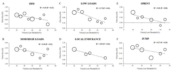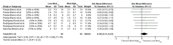 On the other hand, this research is not exempt from limitations. Firstly, all the studies included male-only samples, so the knowledge on the strength and athletic adaptations produced by the different VL thresholds should be extended to the female population. Secondly, a reduced range of exercises was examined. On this matter, although squat and bench press represent two of the main multi-joint exercises used in RT routines, it would be of great practical value to amplify these analyses to other upper- (e.g., prone bench pull or shoulder press) and lower-limb (e.g., hip thrust or deadlift) exercises. Thirdly, the similarities between studies in terms of the subject’s RSR (range 0.9–1.5 kg·kg−1), duration (range 5–8 weeks), or training frequency (2–3 sessions/week) limited the implementation of meta-regression analyses to examine the possible influence of these parameters on our findings. Finally, only sprint and jump abilities were examined as parameters of athletic performance, so future studies are encouraged to include other sports abilities such as throws, changes of direction, or other specific tests (e.g., Wingate test).