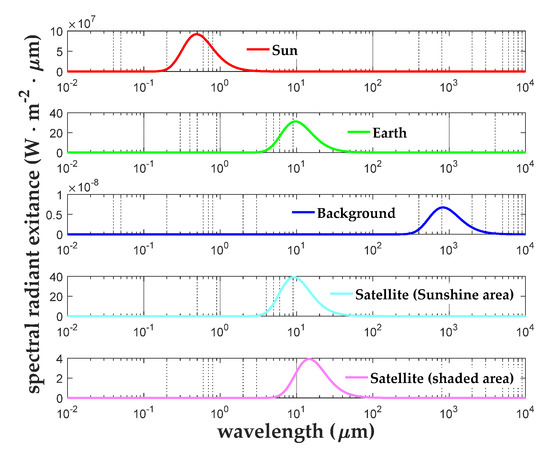 Solar radiation, Earth radiation, background star radiation, and the target’s own radiation are the principal sources of radiation reflected by space targets. The sun, the Earth, and the background stars, for example, can be considered black bodies with temperatures of 5900 K, 300 K, and 3.5 K, respectively. The satellites in sun-synchronous orbit have an average temperature of 314 K in the sunlight zone and 198 K in the shadow zone [18]. Simulations may be used to obtain the radiation output of the sun, Earth, background stars, and satellites at various wavelengths, according to Planck’s law (see Figure 1).