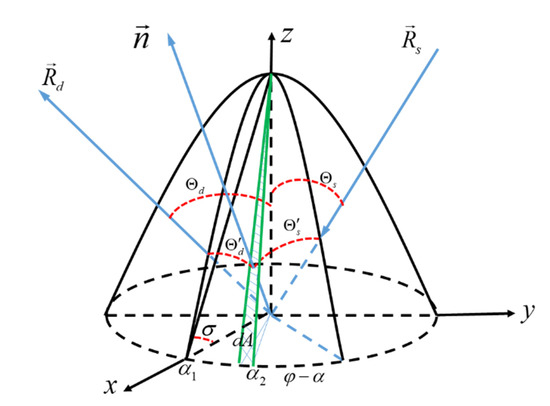 According to trigonometric functions and geometric relations, we are able to obtain the specific representations of the angle between the incident direction of the solar radiation flux and the normal vector of the space target surface element. The angle between the normal vector of the space target surface element and the direction of the radiation flux, reflected by the space target received by the detector, and the unit effective incidence cross section of the conical space target can be seen in Figure 2.