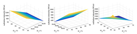 The value range of the phase angle is defined as . According to the literature research, when the phase angle is about , the detector has the best observation conditions for space targets [20]. Therefore, we set the phase angle as , , and , respectively, to explore the effect of the phase angle on the radiation intensity of the space target received by the detector. The inclination of the conical target also has a certain influence on the incident angle of sunlight. Considering the actual processing situation, the conical target inclination is generally set to or . When the conical target inclination and the phase angle are determined, the value of M is determined only by , and the value of N is determined only by . The extreme value of the solar radiation intensity reflected by the space target is related to the range of spatial azimuth. The value interval of the spatial azimuth obtained in each case is different, so the extreme value of the radiation intensity, reflected by the space target received by the detector, also changes in different cases. Taking the phase angle value of and the conical target inclination value of as an example, we simulated a three-dimensional plot of the radiation intensity as a function of and for each case under this example condition (see Figure 3). We then simulated the extreme values of radiation intensity of the space target received by the detector under different conical target inclinations, phase angles, and cases, and the simulation results were shown in Table 1.