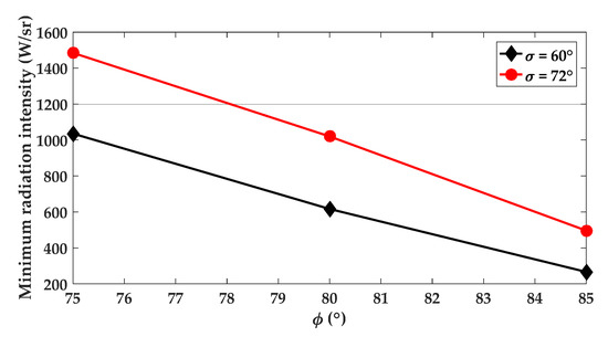 Cases 1 and 3 have extremely small incident angles or observation angles, which will make it difficult for the detector to capture the space target and aggravate the difficulty of space detection by the detector. In Case 4, whether the observation angle or the incident angle, the angular span is very large, which leaves sufficient time for the detector to capture the space target, which facilitates the space detection of the detector. Therefore, the following analysis will focus on Case 4. From Table 1, we can clearly see that the increase of the conical target inclination will lead to the increase of the minimum value of the radiation intensity. The increase of the phase angle will lead to a decrease in the minimum value of the radiation intensity. We plot Figure 4 to visually represent this changing trend. According to the findings, the radiation intensity reflected by the conical target has a minimum value of 266.6 W/sr when the conical target inclination is and the phase angle is .
