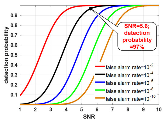 where is expressed as the detection threshold, and is expressed as the error function. Similarly, according to the definition of , we are able to obtain another representation of : . By combining Formulas (10), the relationship between the detection probability, the false alarm rate and is expressed as follows:
