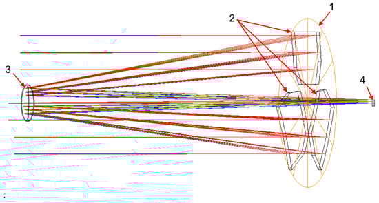 Optical layout of the Ritchey–Chretien type telescope with segmented primary mirror: 1—aperture stop, 2—primary mirror segments, 3—secondary mirror, 4—image sensor.
