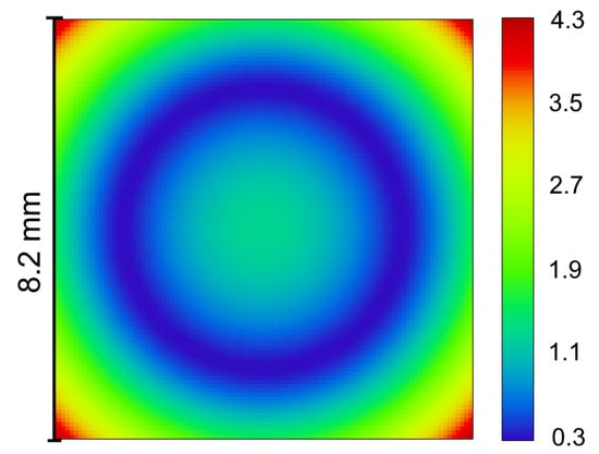 Using Equations (1)–(10) we can produce the simulated interferograms for the nominal optical design and for that with the optical element misplacements. In each case, we can compare the two interferograms and propose simple metrics correlated with the displacement to be measured. In order to simplify the computations, hereafter we consider pixel binning with an 8-pixel pitch, so all the testing interferograms represent matrices with elements.