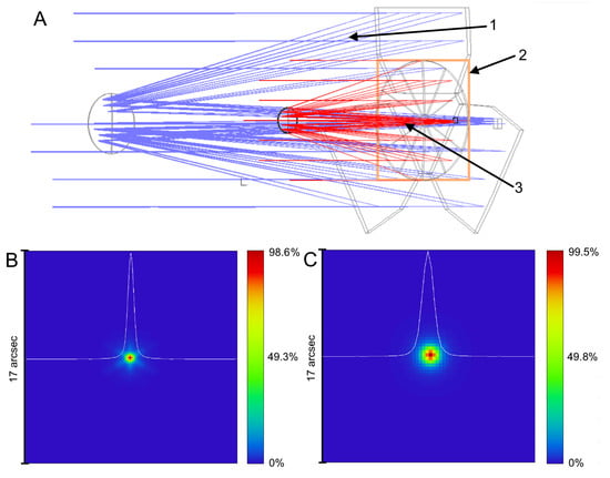 Comparison of a deployable primary mirror case with a monolithic one: (A) optical designs compared in scale (1—deployable telescope, 2—1U unit front side, 3—telescope with monolithic mirror), (B) PSF with the deployable mirror, (C) PSF with a monolithic mirror.