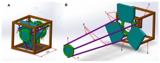 Figure 4B depicts the telescope in a fully deployed state, where 1 are the primary mirror segments, 2 is the secondary mirror, 3 is the detector unit, 4 is the 1U CubeSat frame, 5 is the telescope structure basement ring with the segments tilting and rods unwrapping mechanisms, 6 are the secondary mirror supporting rods and 7 is the secondary mirror mount. All the electronics, power supply, and other systems necessary for the satellite operation may be placed in another CubeSat unit, which is not considered here. We should also emphasize that some functions of the opto-mechanical design, as limiting of the side illumination, are not considered here. However, some internal baffle can be placed in the opening of the support ring 5. This baffle should limit the area of the underlying Earth surface, which illuminates the detector, to the nominal field of view. Then it should be possible to find a small region that can be used as a dark background for the positioning system image.
