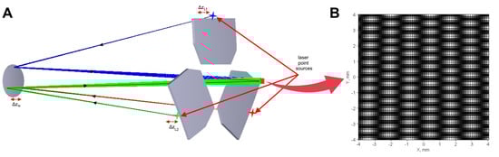 Operation of the digital holographic positioning sensor: (A) illumination of the telescope focal plane by the auxiliary laser sources; (B) sample interferogram recorded with pixel binning.