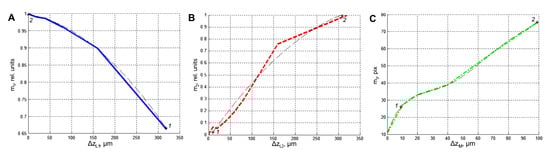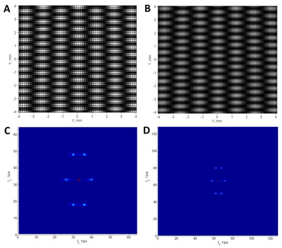 As one can see from the figure, the increase of sampling by a factor of 2 does not change the long-periodic modulations. For clarity, we compare the Fourier spectra of these patterns—the case of m pitch is shown in Figure 6C and that for m in Figure 6D, respectively. One can see that the spectra are re-scaled, but all the features remain identical. Thus, the approach based on the Fourier spectra analysis described before should remain valid regardless of the detector undersampling effect. Moreover, we assume that since we use a modulated pattern, our technique should not be sensitive to ambiguity, which is typical for some classical interferometric methods.