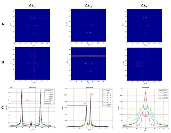 We should note that the sensor with such an element size acts as an additional spatial frequencies filter. In this case, we detect only long-periodic modulations of the fringes, but not the exact fringes. The latter ones have periods depending on the wavelength and angle of incidence, which is equal to m in our case []. However, the frequencies of interest remain stable with respect to the sampling. In order to demonstrate it, we compare the interferogram simulations for m (Figure 6A) and m (Figure 6B) pixel pitch values.