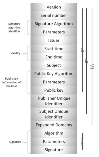 The digital certificate is an unencrypted file with a public encryption key that contains organizational details about the certificate owner and the encryption key. The format of the certificate is defined by the X.509 standard. X.509 certificates play an important role in encrypting data transmission between two parties under the HTTPS protocol. X.509 is a signed data structure that binds a public key to a person, computer, or organization and is used in many Internet protocols, including SSL/TLS [30,31]. X.509 is also complex in terms of structure and syntax. Each certificate consists of a sequence of three required fields: tbcertificate, SignatureAlgorithm, and SignatureValue. The first part, the tbcertificate, contains the subject, the publisher, and other basic information. Compared to Version 1 certificates, Version 2 certificates have added the SubjectUniqueID (subject unique identifier) and trusteduniqueid (issuer unique identifier) fields. In addition, extended fields have been added to the Version 3 certificate. The second part, SignatureAlgorithm, contains the identifier of the signature algorithm used by the certificate authority (CA) to sign the certificate. The third part, SignatureValue, records the digital signature calculated on TBcertificate. In a Public Key Infrastructure (PKI), certificates are usually organized together with their issuer into a certificate chain. The structure of the X.509 certificate is shown in Figure 1.