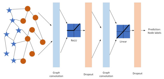 Where , is the adjacency matrix mentioned in Theorem 1, D is the degree matrix of A (), and X is the input layer representation feature matrix. Each node i has feature . The characteristic matrix of a node can be represented by the matrix , where N is the number of nodes and M denotes the number of features per node. is the weight matrix for the first layer and is the weight matrix for the second layer. The first layer of the activation function is . The second layer is the linear activation function.