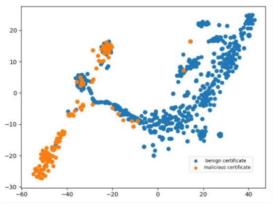Extracted certificate features play a very important role in the detection of malicious certificates, and the results of malicious certificate detection algorithms depend heavily on whether the extracted features can describe the data well. Feature extraction of digital certificates is either by manual methods or by using expert rules to extract valid fields. Manual methods of extracting features [11,12] obtain features directly from certificates, digitizing features with one-hot encoding [13], implementing discrete data vectorization with CLE, or processing data to get features with TF-IDF [14]. To address the shortcomings of manual feature extraction, tools for extracting features through expert rules were designed and implemented. Jiaxin Li et al. designed and employed the VFE [15] method for certificate verification and feature extraction; the VFE extracts features through four parts: base analysis, criteria checking, certificate chain construction, and certificate chain verification. The extracted features were put into classical machine learning models and ensemble learning models for training. The ultimate result is that the ensemble learning model has better results for malicious certificate detection. Dong et al. [16] designed and implemented a certificate detection system containing a certificate downloader, a feature extractor, a classification actuator, and a decision-making section. The feature extractor uses expert knowledge to extract features in this system. This method is easier and less time-consuming, but blacklist expansion is time-consuming and tedious.