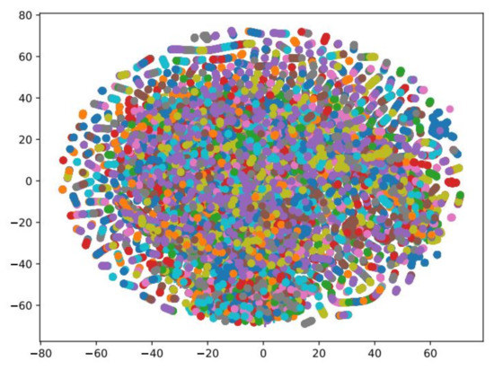Visual classification of certificate attributes by Cert GCN. Different colors in the figure represent different documents, and each point represents an attribute of the document. There are 8061 digital certificate files in total.