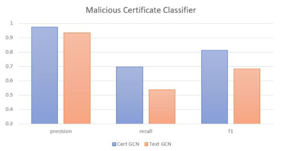 Accuracy, recall, and F1 values for Cert GCN and Text GCN malicious certificate classifiers.