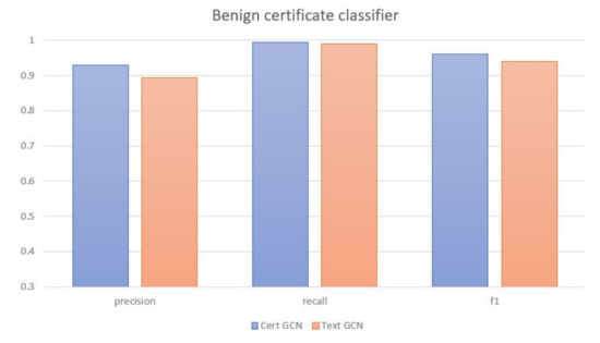 Evaluation of model results of benign certificate detection by Cert GCN and Text GCN.