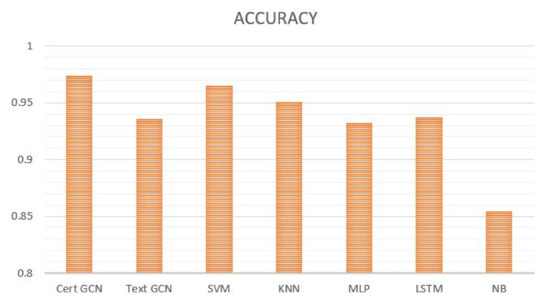 In this paper, the accuracy of Cert GCN is compared with that of SVM, KNN, MLP, LSTM, NB, and Text GCN. We find that the accuracy of Cert GCN is better than that of all these other algorithms, and Cert GCN achieves 97.41% accuracy in detecting malicious certificates. The model with the lowest prediction accuracy is NB, which has an accuracy of 85.42%, as shown in Table 5 and Figure 10.