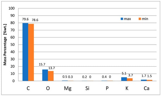 EDS analyses of cleaned and milled biochar pellets, and mass percentages of the detected elements. Maximum and minimum values obtained on three repeated spectra on the same sample are shown.