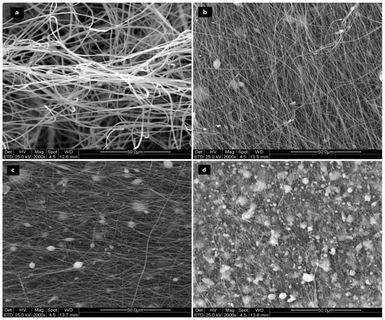 In Figure 6, it can be seen that the grains were well dispersed inside the fiber mat, and in this composition, they occupied a large portion of the material mass. Fiber diameters remained around 1 µm for all the investigated cases. The dimension of biochar beads was calculated with ImageJ software, and it resulted in below 10 microns in all observed cases. The 50–50% sample, that represented a bold substitution rate, still showed the fiber completely formed, and the biochar particles seemed blended to the carbon structure of the fibers.