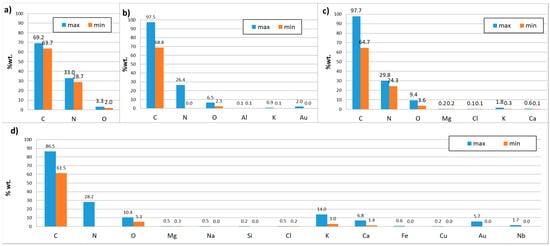 The powder composition was analyzed using EDS analysis. Figure 4 shows the results of the composition analysis, outlining the maximum and the minimum of amounts recorded for each element.