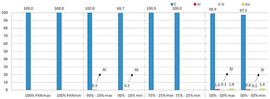 The EDS analyses suggest that these compounds probably evaporated in the furnace due to the severe thermal treatment, performed at 1700 °C, as expected and confirmed also by the literature for various inorganics [38,39]. The fiber carbon content peaked after the process, reaching values from 97.2% to 100%, and the remaining percentage was covered by metals used to perform the ESEM analysis (gold and aluminum). Silicium was present only in traces. Figure 8 presents the results of the analysis.