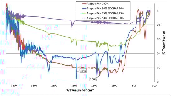 Stabilized/cyclized samples were analyzed with an IR spectrometer. Figure 9 reports the as-spun spectra. The spectra for the 100% PAN fiber can be compared to the literature [40] to properly assess if the polymerization occurred correctly. The peak at approximately 2241 cm−1 represents the triple bond (C≡N), as described in [41]. Kim et al. [41] also referred to the peak at 1668 cm−1 (1661 in the figure) to the precursor. As expected, the choice to use high-temperature gasification biochar impacted the results reported in Figure 9. Gasification biochar was produced in high-temperature environments (starting from 900–1100 °C in the combustion zone, then decreasing to 600 °C at the end of the reduction zone), and these conditions led to a structure where all of the functional groups left the surface. This can be observed by the general and diffuse decrease in the spectra transmittance (therefore, an increase in the material absorbance) as the amount of biochar in the preparation increased. Similar results were reported by Taheran et al. where active char was used as an additive in PAN fibers [20].