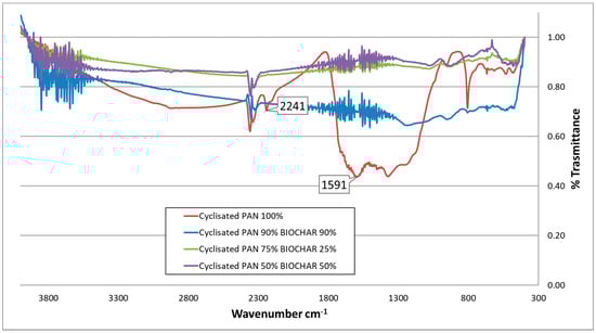 The spectra of the cyclized PAN (Figure 10) showed a reduction in the above-mentioned peak corresponding to the C≡N bond, and an evolution of the peak at ~1591 cm−1 was observed. This peak corresponds to the C=N band. This indicates that the cyclization took place and a ladder-like structure was formed [42]. This structure enables the PAN fibers to withstand the high-temperature carbonization temperature [43]. This phenomenon was less and less pronounced as the biochar share in the solution increased due to the absorptive behavior previously described. Biochar had two major effects on the spectra: on the one hand, biochar “diluted” the amount of PAN, thus reducing the signal of the peaks that can be easily recognized in the 100% spectrum. Secondly, the char structure introduced a series of noises above 3000 cm−1 and between 1300 and 1800 cm−1. The literature review described the biochar-induced noises as associated with different groups [44,45]. As reported by [46], the presence of several peaks in the range of 3400–4000 cm−1 may be assigned to the water absorbed. The spectra recorded in this work did not show sharp peaks in that area, but a general noise of the signal. Biochar had strong hygroscopic behavior, and the shares of biochar in the material may have adsorbed large amounts of water, leading to high noises in the test.