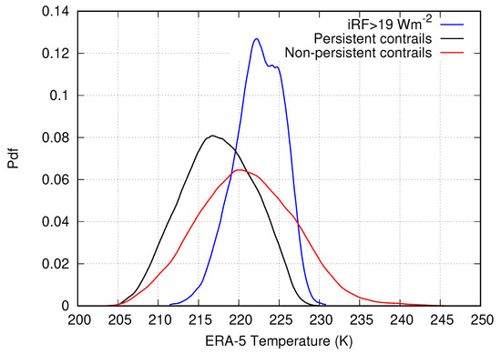 Temperature probability density functions (pdfs) in general situations without persistent contrails (red), in situations that allow persistent contrails (black), and in situations for persistent contrails that have a particularly large iRF (blue). The pdfs comprise the temperatures that ERA-5 reanalysis data show for the respective flight points from MOZAIC. Note that the deciding factors for persistence are MOZAIC’s thermodynamic quantities.
