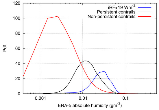 Figure 1 shows temperature distributions for the general situation (red, 390,486 cases), in situations that allow persistent contrails (black, 47032 cases), and in situations with large iRF (blue, 4052 cases). The pdfs show the temperatures from the ERA-5 reanalysis interpolated to the respective flight points from MOZAIC; however, the deciding factor for persistence (for all plots) are MOZAIC’s thermodynamic quantities. Only minimal differences between the temperature distributions of MOZAIC and ERA-5 are observed (not shown), indicating that ERA-5 predicts temperatures for the flight points from MOZAIC well. MOZAIC aircraft fly at temperatures between 200 and 250 K. Persistent contrails occur at the lower end of the distribution, and the Schmidt-Appleman threshold sets an upper limit for situations with contrails at about 230 K. Contrails with large iRF occur predominantly at temperatures a few degrees (say, 3 to 8 K) below the threshold, but not at the lowest temperatures that persistent contrails in our data attain. This is explained by the fact that absolute humidity generally increases with temperature, such that more ice can form and higher contrail optical thickness can be reached at higher temperatures, not too far below the contrail formation threshold. Figure 2 confirms that contrails with large iRF particularly develop at the highest absolute humidities, as the pdf for this condition (blue line) is shifted relative to that for persistent contrails in general (black line) towards higher values.