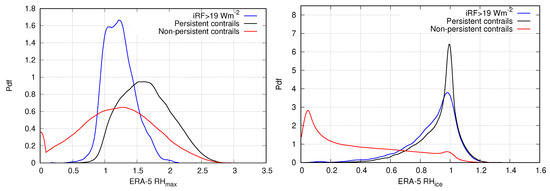 The variable that seems best suited for an improved prediction of the persistence of contrails is the local lapse rate. It describes the vertical temperature gradient and is a measure for the stability of the atmosphere (stratification). The difference between the three scenarios (persistence with large iRF, persistence, and non-persistence) is best visible when looking at the cumulative distribution functions (cdfs) in Figure 6, left. The lapse rates range from about to nearly 10 K km. While roughly 70% of the cases that don’t allow persistent contrails or no contrails at all have a lapse rate below 5 K km, such low values occur only in about 25% of situations that allow persistent contrails and even less (about 15%) so if the latter have a large iRF. However, 20% of persistent contrails occur in air masses with lapse rates exceeding about 8 K km, and such high values do hardly occur in situations that do not allow contrail formation or persistence. Hence, persistent contrails and, in particular, persistent contrails with high iRF develop under rather high lapse rates with a weak stratification. Negative lapse rates occur with temperature inversions, which happen when the tropopause is close to the flight level. For physical explanations of the relation between ice supersaturation (i.e., contrail persistence) and high local lapse rates, see [16].